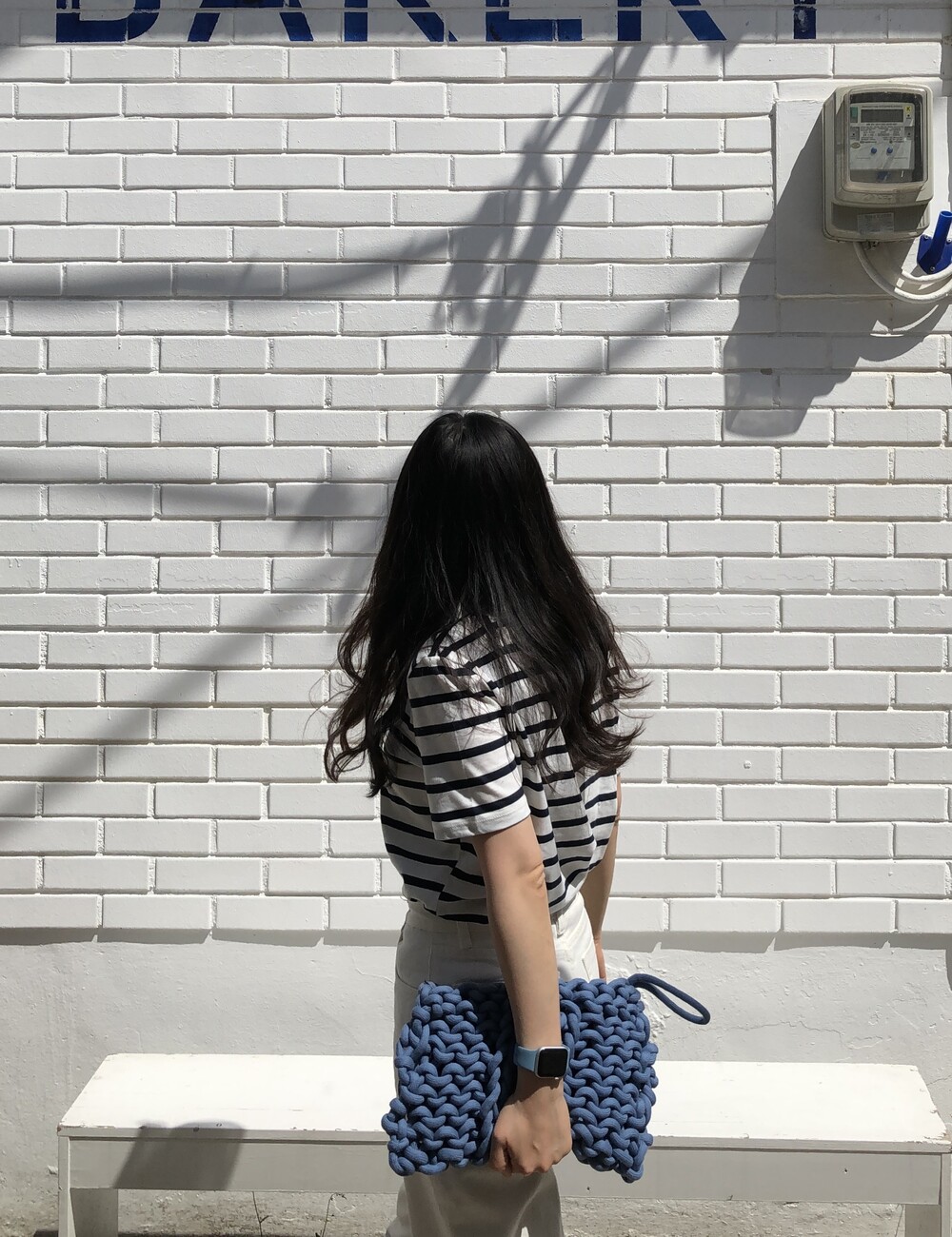 알리 사라백 블루는 튀지 않는 무난한 컬러감으로 다양한 캐주얼 스타일링을 쉽게 소화할 수 있는 꾸안꾸 스타일 만능백입니다. 납작한 사각형 디자인 중간에 스트라이프 위빙으로 세련된 디자인으로 매력을 더해주고 있지요. 착용 시에도 자연스럽게 세련된 쉐잎이 잡히며 튼튼한 이너백으로 모양이 쳐지지 않게 잡아주어 데일리, 세컨백은 물론 여행 시에도 센스있는 스타일링을 완성해주는 아이템이지요. 다른 알리백과는 달리 지퍼로된 클러치 디자인의 사라백은 안전하게 소지품을 수납할수 있을 뿐더러, 핸들이 있어 휴대하기에도 용이합니다.