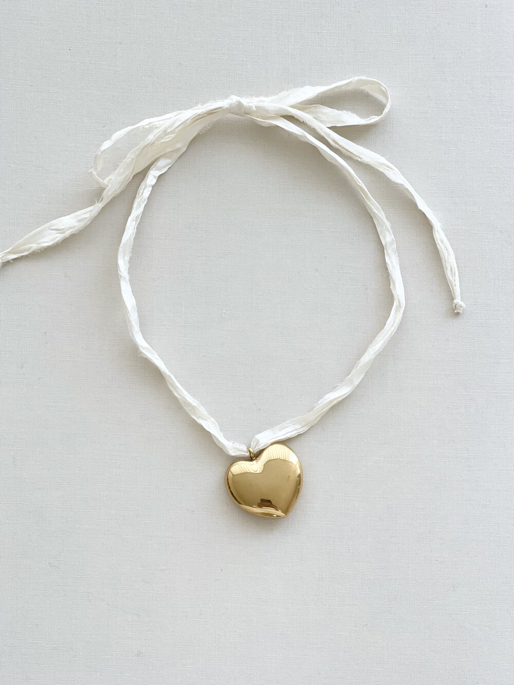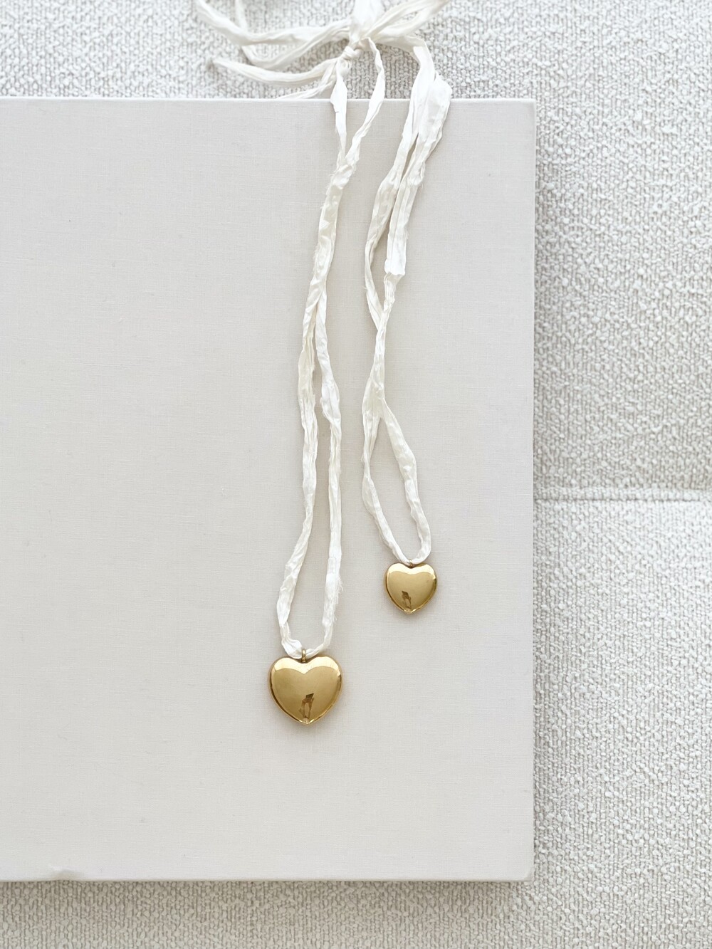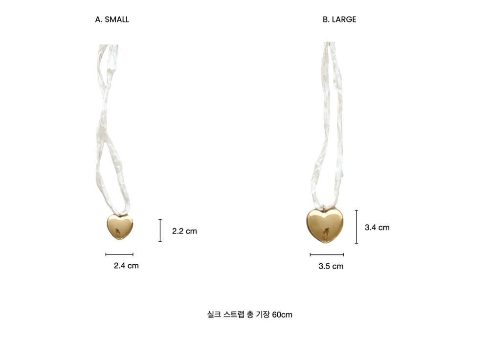 은은하면서도 고급스러운 골드와 아이보리 컬러가 우아하게 어우러지는 Heart Silk Necklace 하트 실크 네크리스를 소개합니다. 포인트 스타일링이 가능한 하트 실크 네크리스는 취향과 OOTD에 따라 기장을 다양하게 조절하여 스타일링하세요. 합리적인 가격대의 하트 실크 네크리스를 스몰과 라지 두가지 사이즈로 선보입니다.