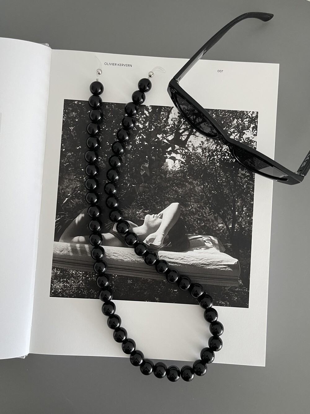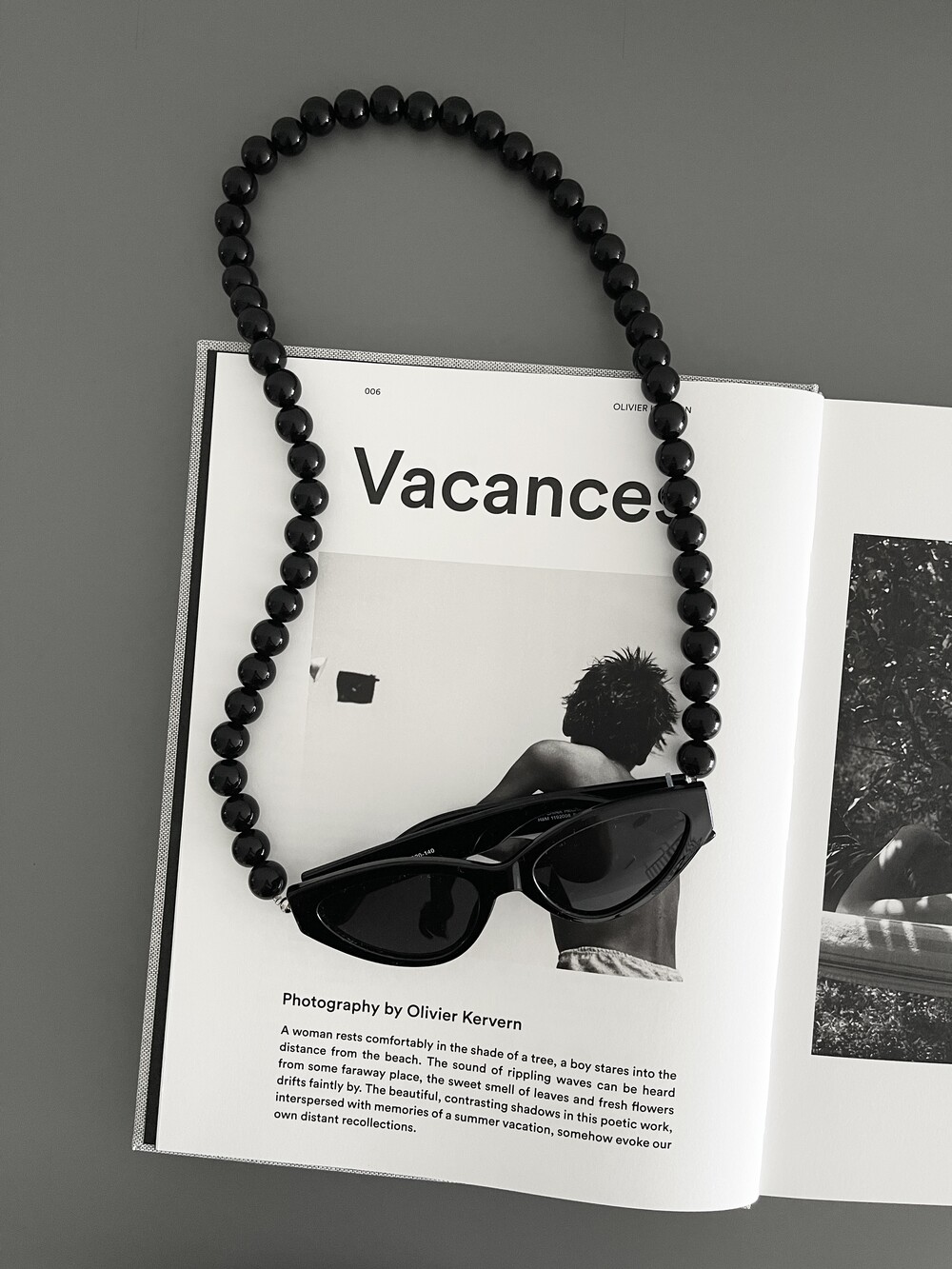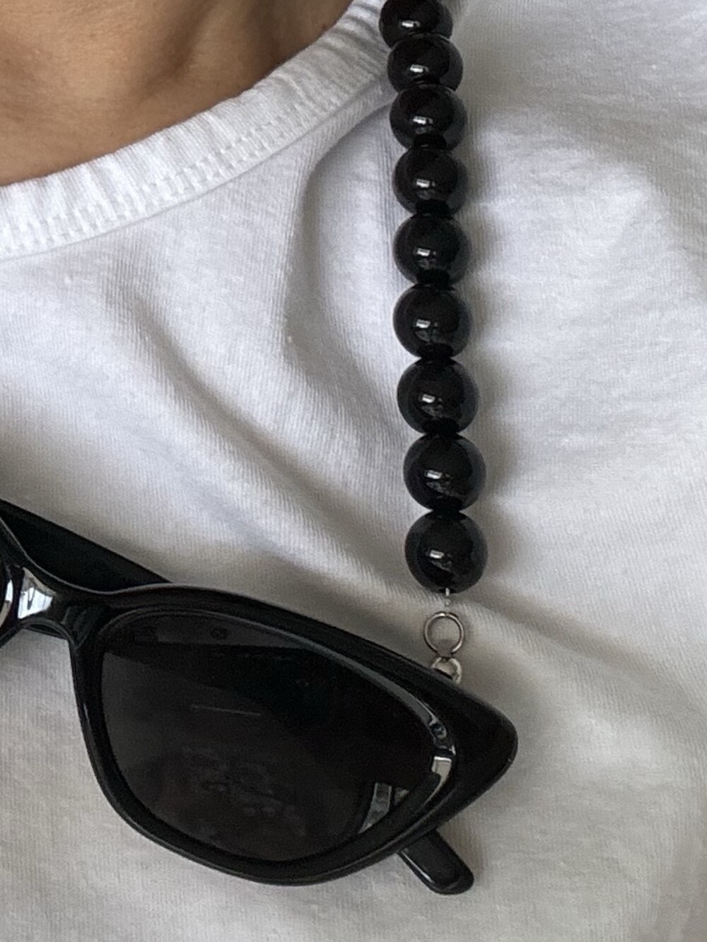 시크한 블랙 컬러볼로 엮여진 Sunglass String 선글라스 스트링을 소개합니다. 14mm 블랙볼로 엮은 볼드함과 적당한 길이감으로 가벼운 썸머아웃핏을 한층 업그레이드 시켜줄 스몰앤그랜드 자체제작 상품입니다. 선글라스 또는 안경에 끼우는 실리콘 디테일로 마무리되어 편리하게 착용하실 수 있습니다.