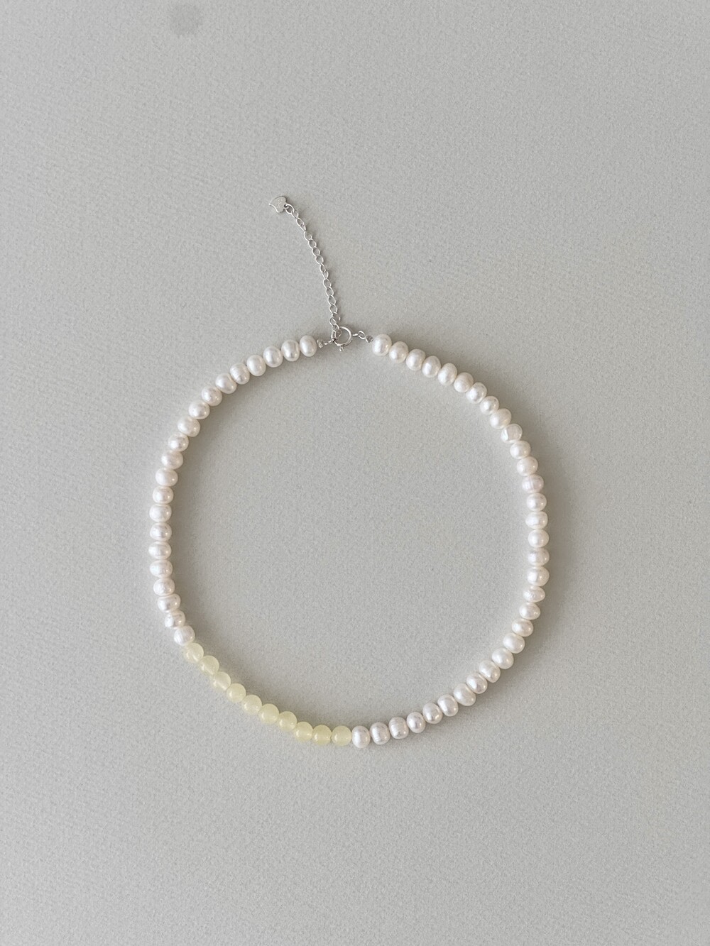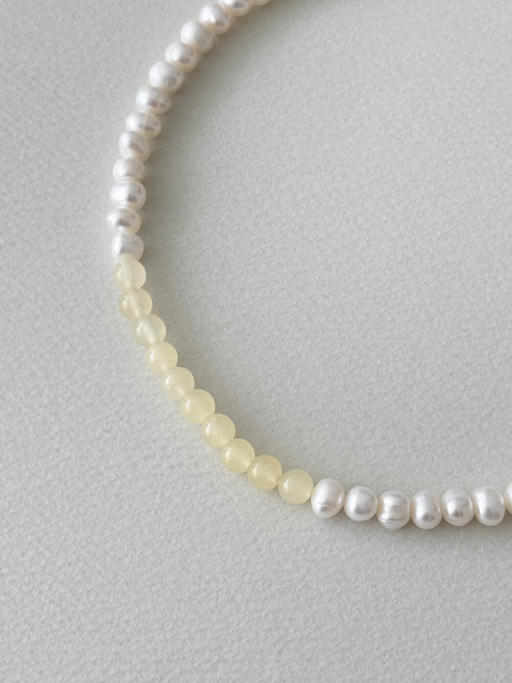 담수 진주와 옐로우 젬스톤이 어우러진 유니크한 스타일의 네크리스입니다. 일반적인 완벽한 형태의 보석이 아닌, 자연 그대로의 담수 진주와 젬스톤의 조합이 당신의 개성을 돋보이게 합니다. 이 목걸이는 ‘완벽함’이 아닌 ‘자연스러움’과 ‘개성’을 사랑하는 모든 이들에게 추천드립니다.