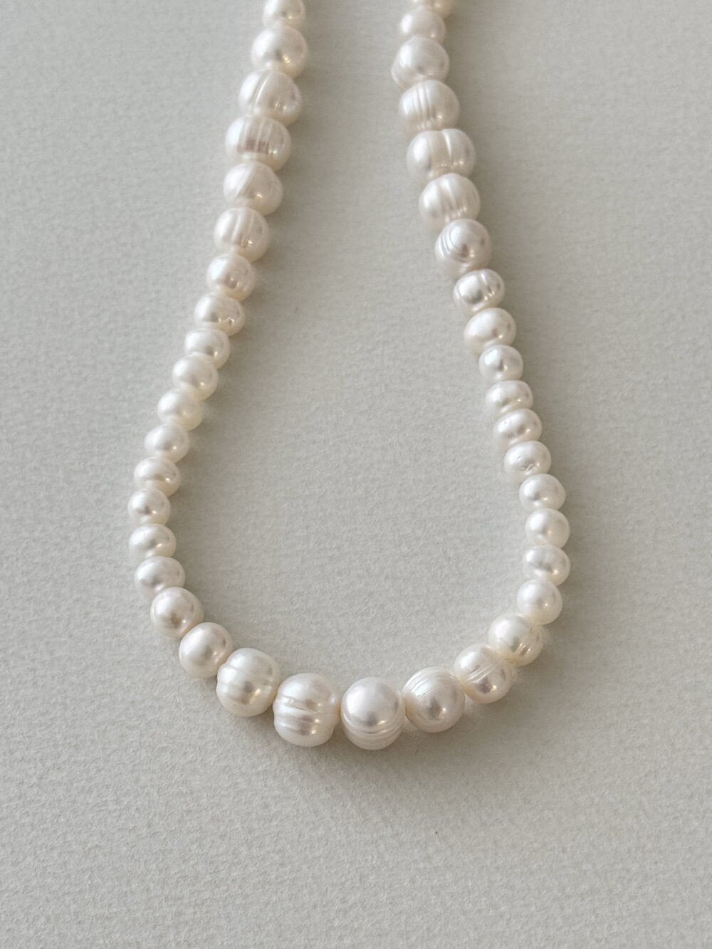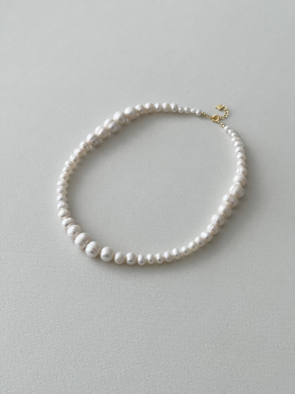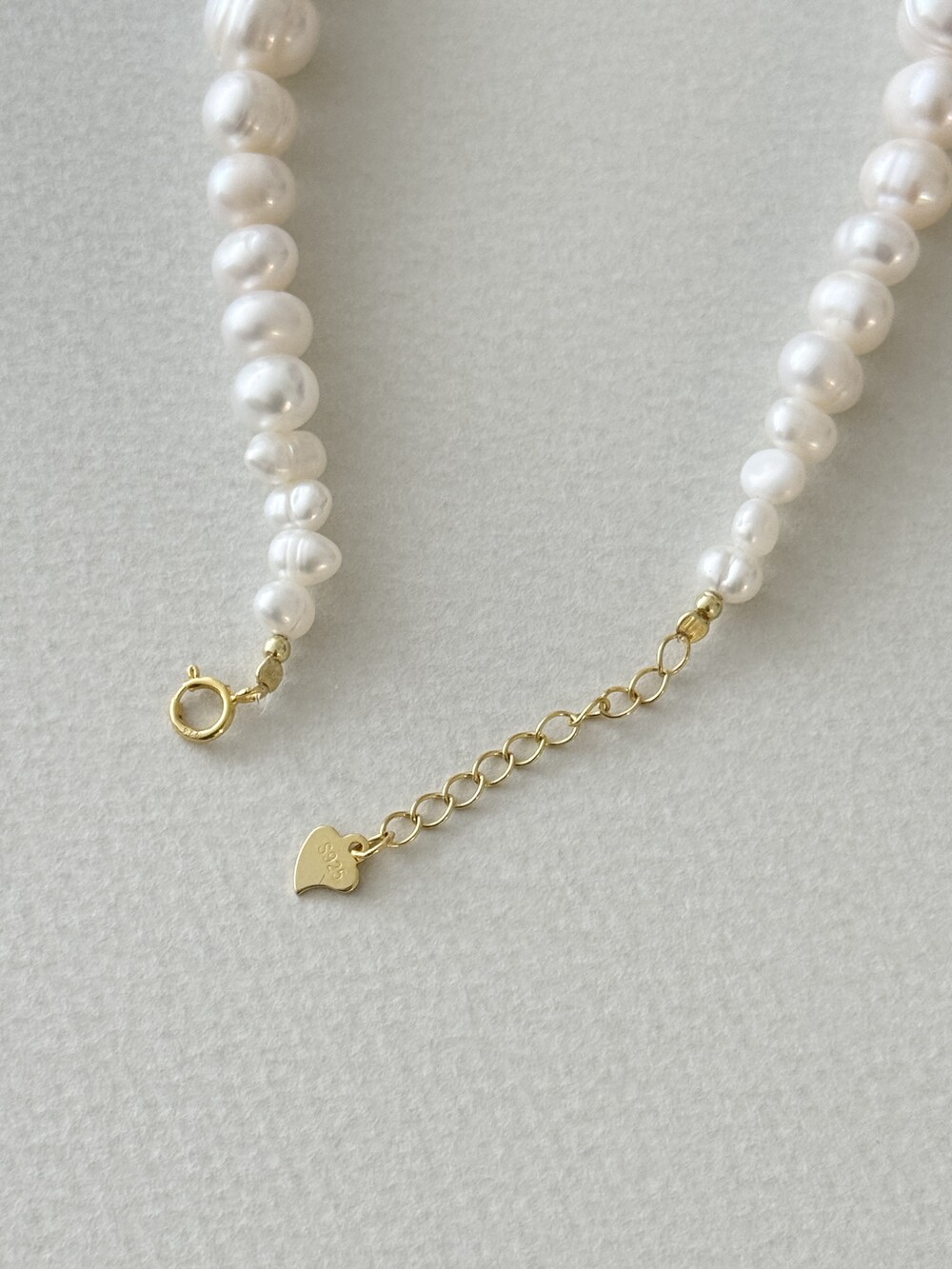 진정한 아름다움은 완벽함이 아닌, 자연 그대로의 모습에서 비롯된다는 것을 느껴보세요. 독특한 형태의 담수 진주로 만든 이 목걸이는 매일 새로운 당신의 매력을 표현합니다.