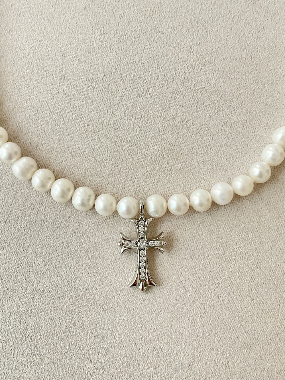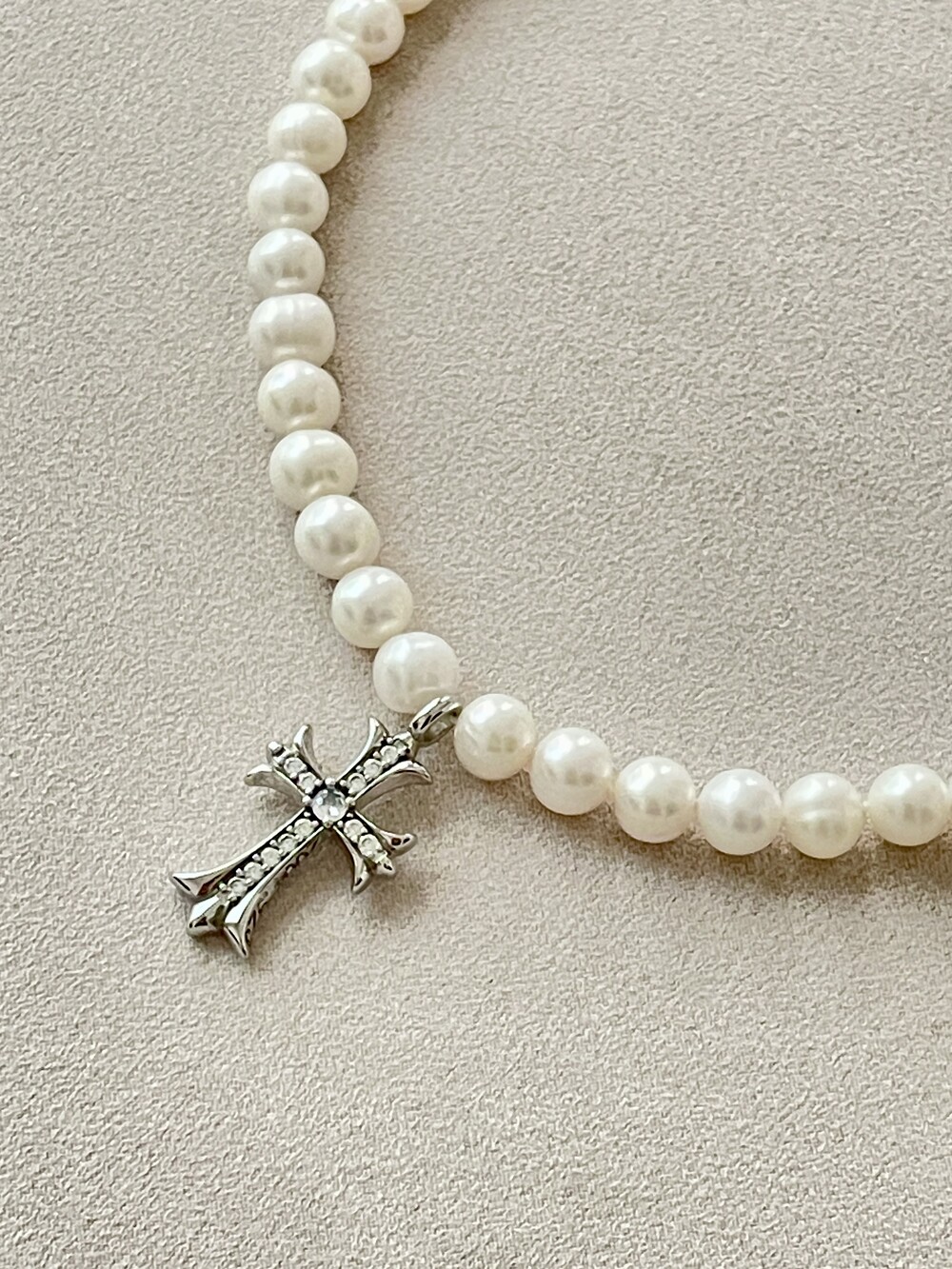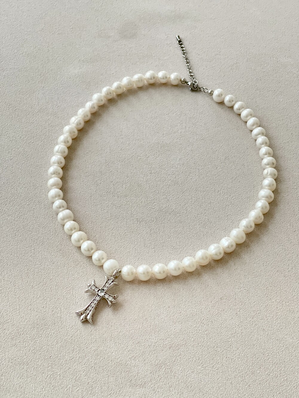 [S&G] Pearl Cross Necklace 펠 크로스 네크리스는 담수 진주와 실버925 크로스 펜던트가 조화롭게 아우러져 세련되고 시크한 룩을 연출 할 수 있습니다. 데일리하게 착용하기 좋은 펄 네크리스로 단독 착용만으로도 클래식하면서도 트렌디한 포인트의 네크리스로, 모던한 룩을 완성 시켜 줍니다.