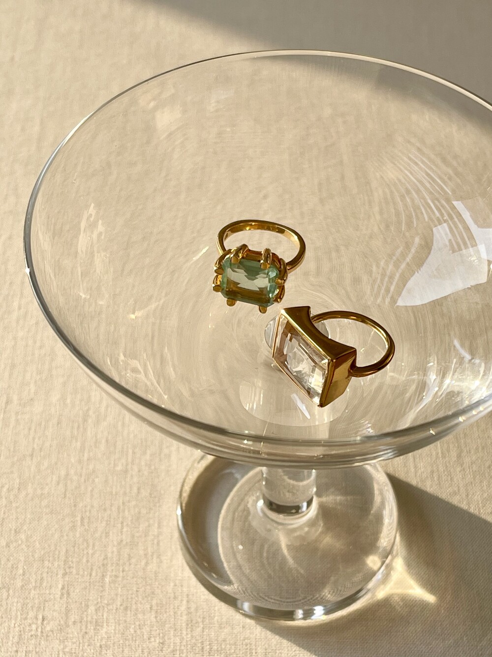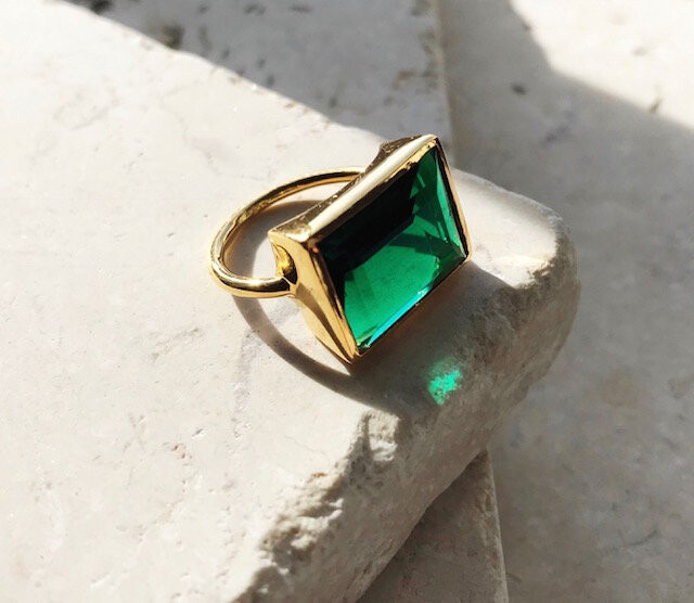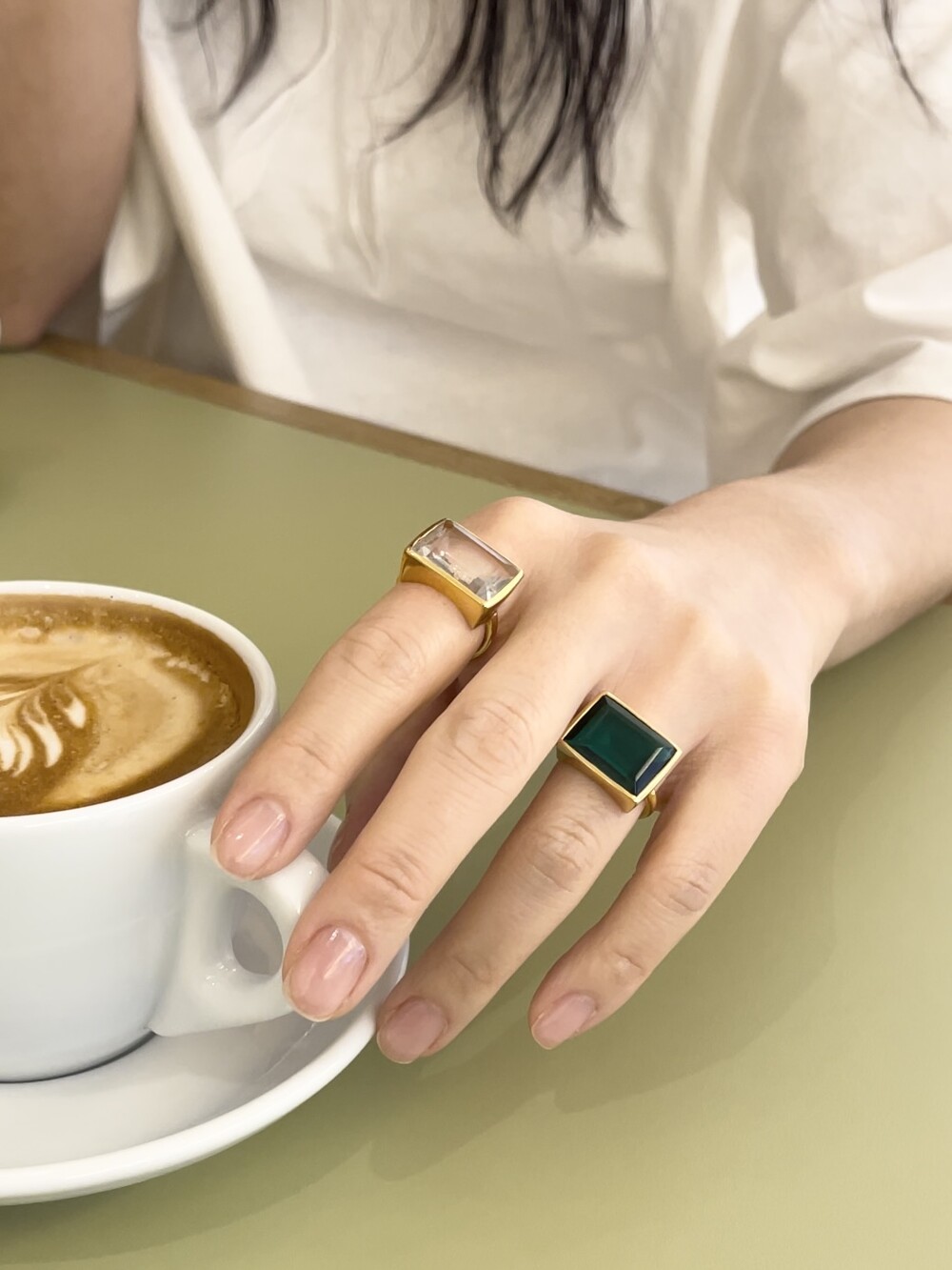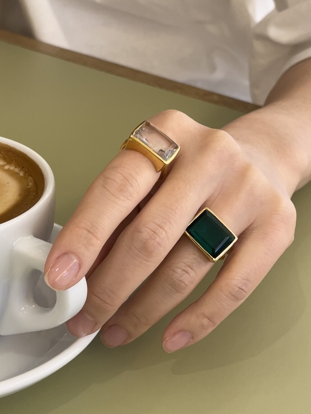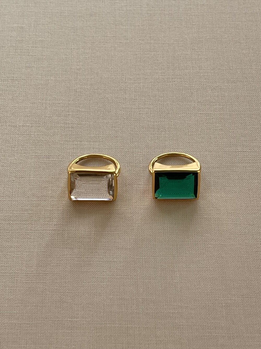 가로 1.8 cm 세로 1.3cm 사이즈의 볼드한 원석을 Clear 클리어, Emerald 에머랄드 두가지 컬러로 소개합니다. 모든 제품은 천연 스톤과 22K 도금된 스털링 실버로 제작되었습니다.