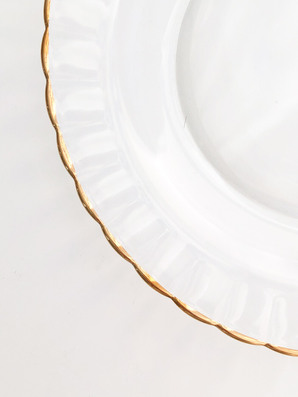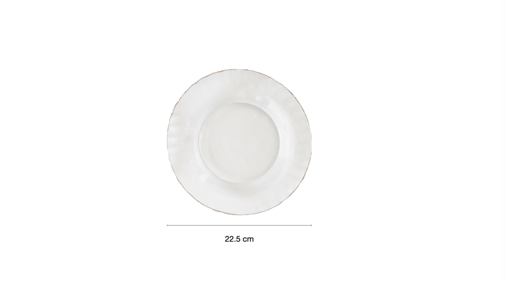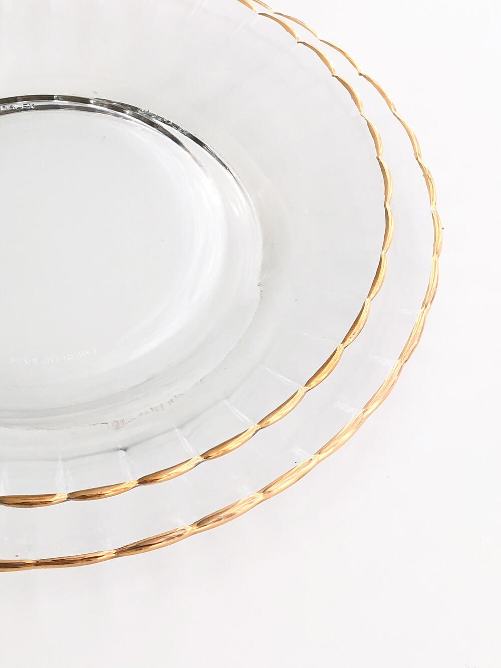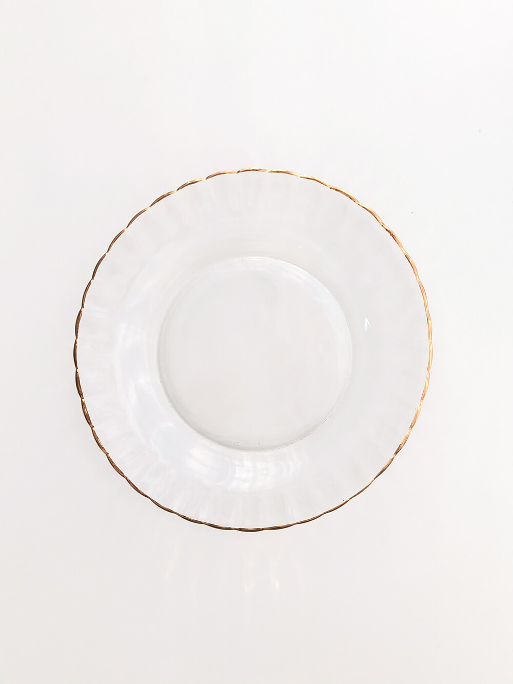 꽃모양의 섬세한 가장자리 디자인과 매혹적인 골드빛이 돋보이는 Glass Floral Gold Rim Plate 글라스 플로랄 골드림 플레이트를 소개해드립니다. 너무 튀지않으면서도 화려함과 유니크함을 지닌 디자인이 플로랄 골드림 글라스 플레이트의 매력입니다. 밋밋할 수 있는 심플한 글라스 플레이트에 우아한 18K골드로 림 부분을 도금하여, 한층 더 세련미를 발산하고 있습니다.