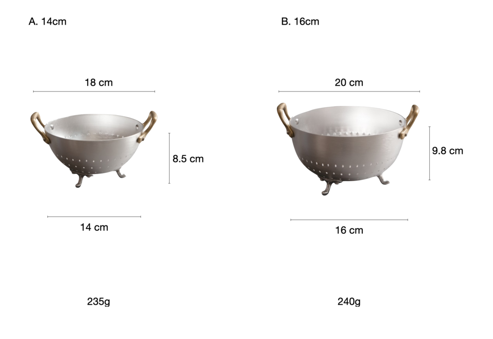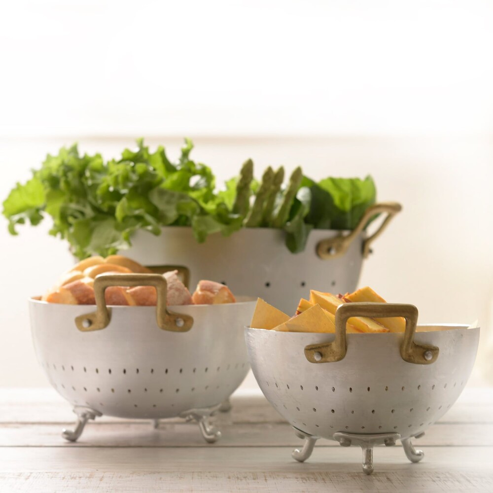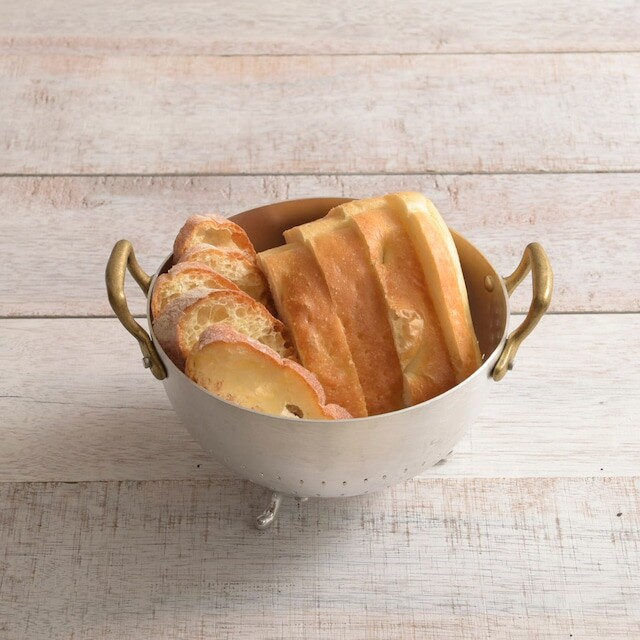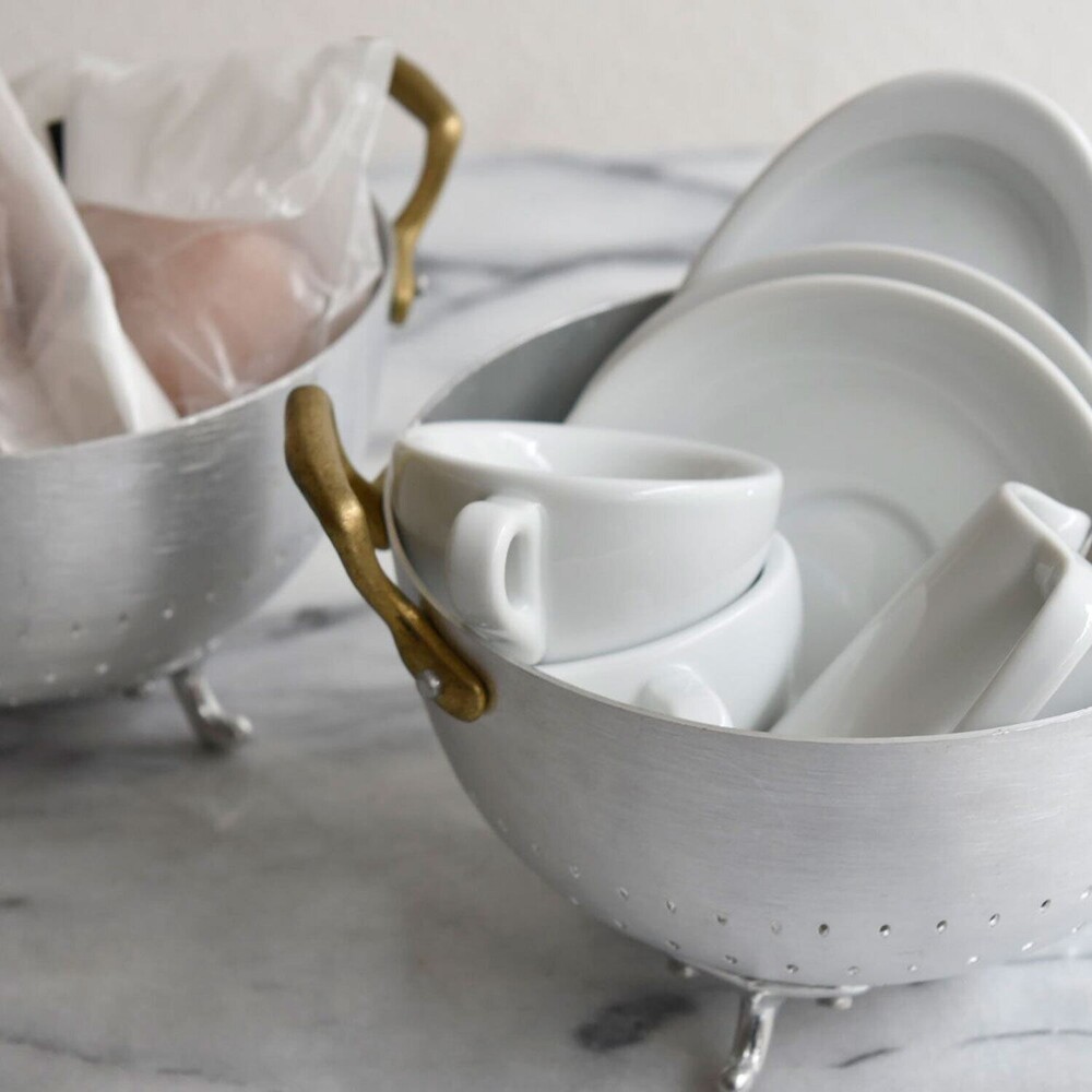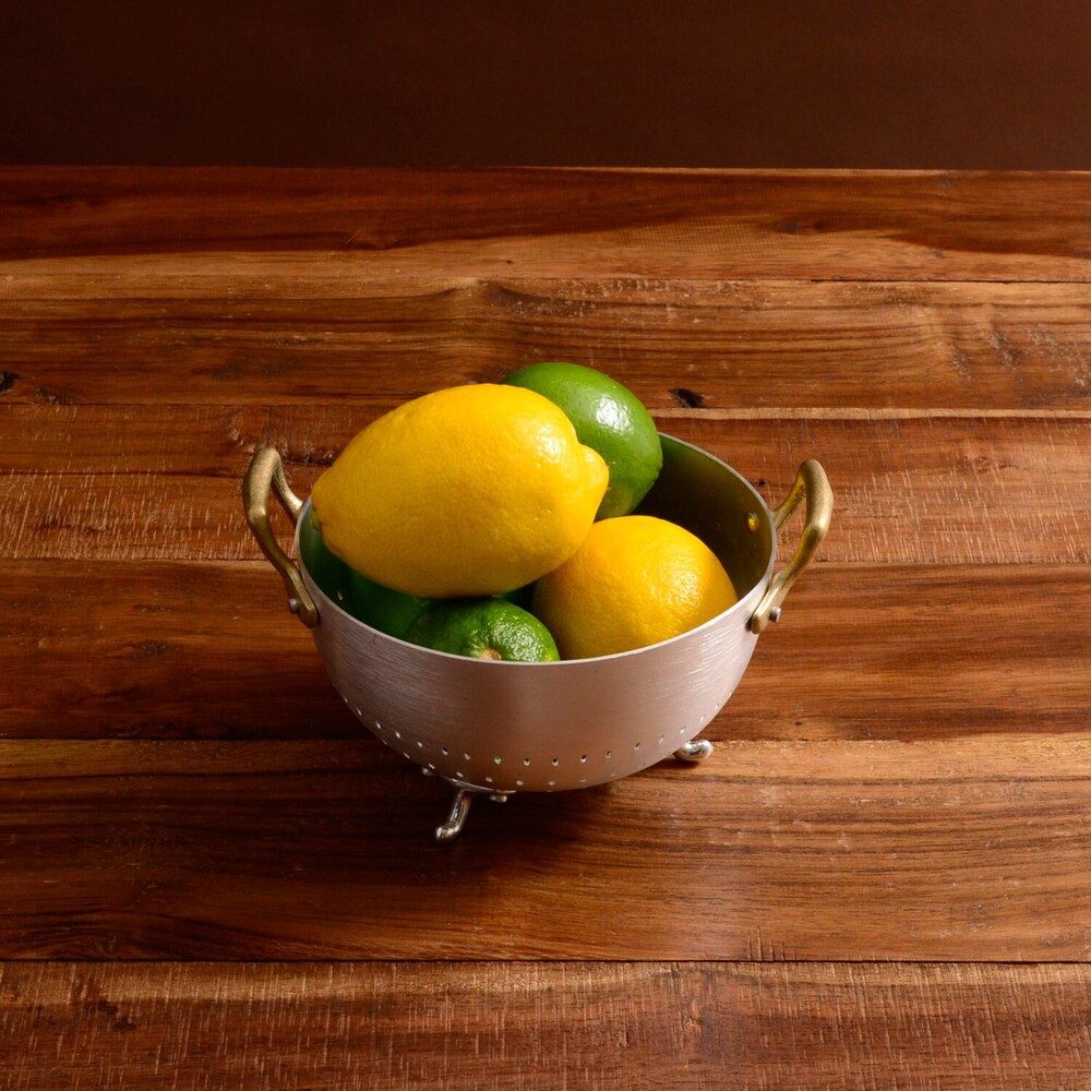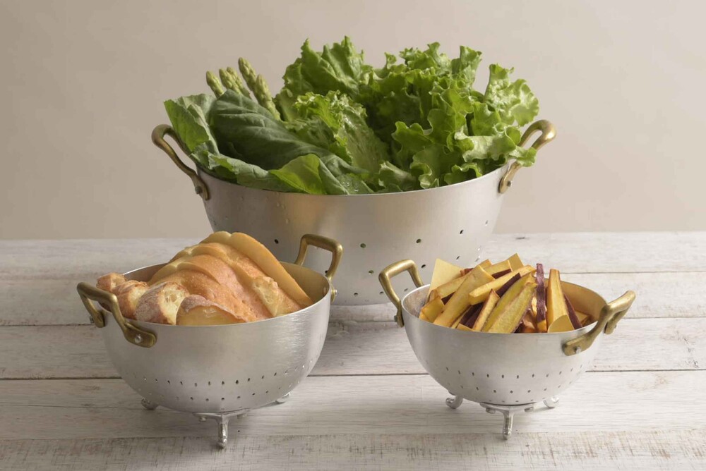 Ottinetti 오티네티의 Mini Colander 미니 콜랜더를 14cm와 16cm 두 가지 사이즈로 소개합니다. 세척한 식재료를 담아 놓거나 옮기기에 좋으며, 빵이나 과일, 간단한 스낵 및 핑거푸드를 담아 놓을 수 있는 바스켓 등 다양하게 활용할 수 있는 아이템 입니다. 작은 바구니 모양에 세발 받침, 알루미늄과 브라스 핸들의 조합 그 자체만으로 앤틱하고 빈티지스러운 무드를 연출합니다.