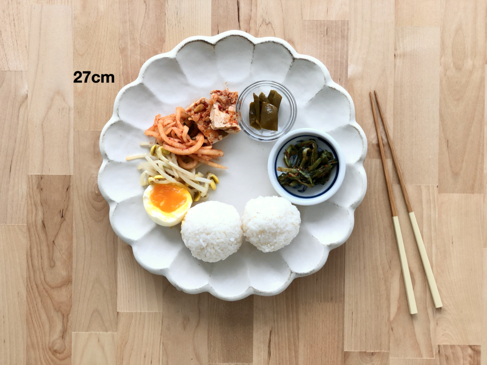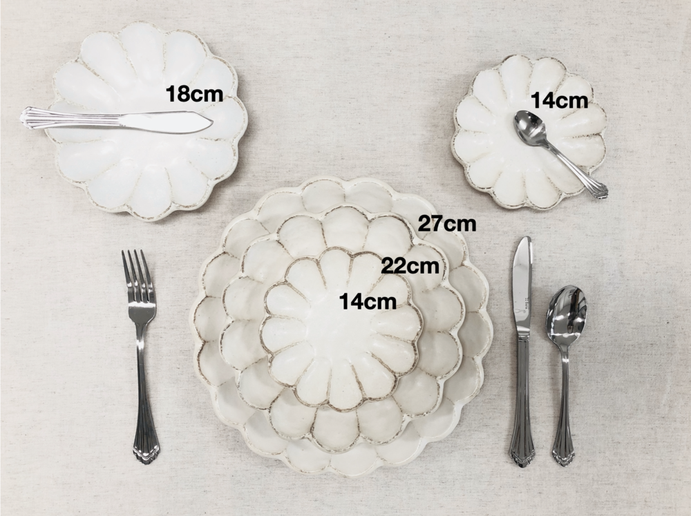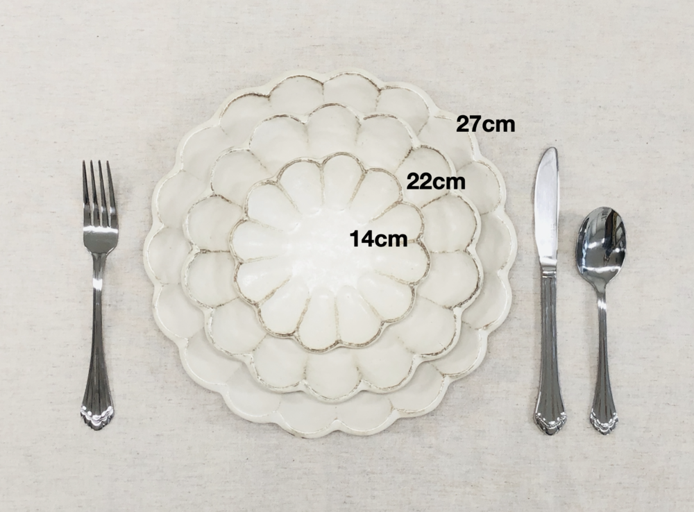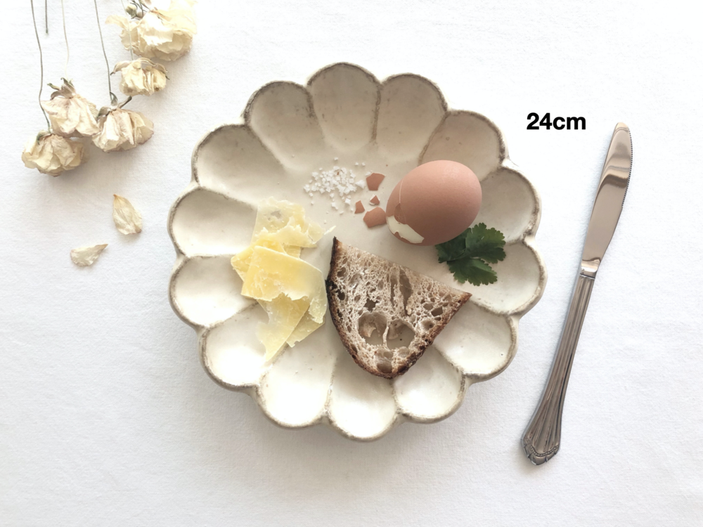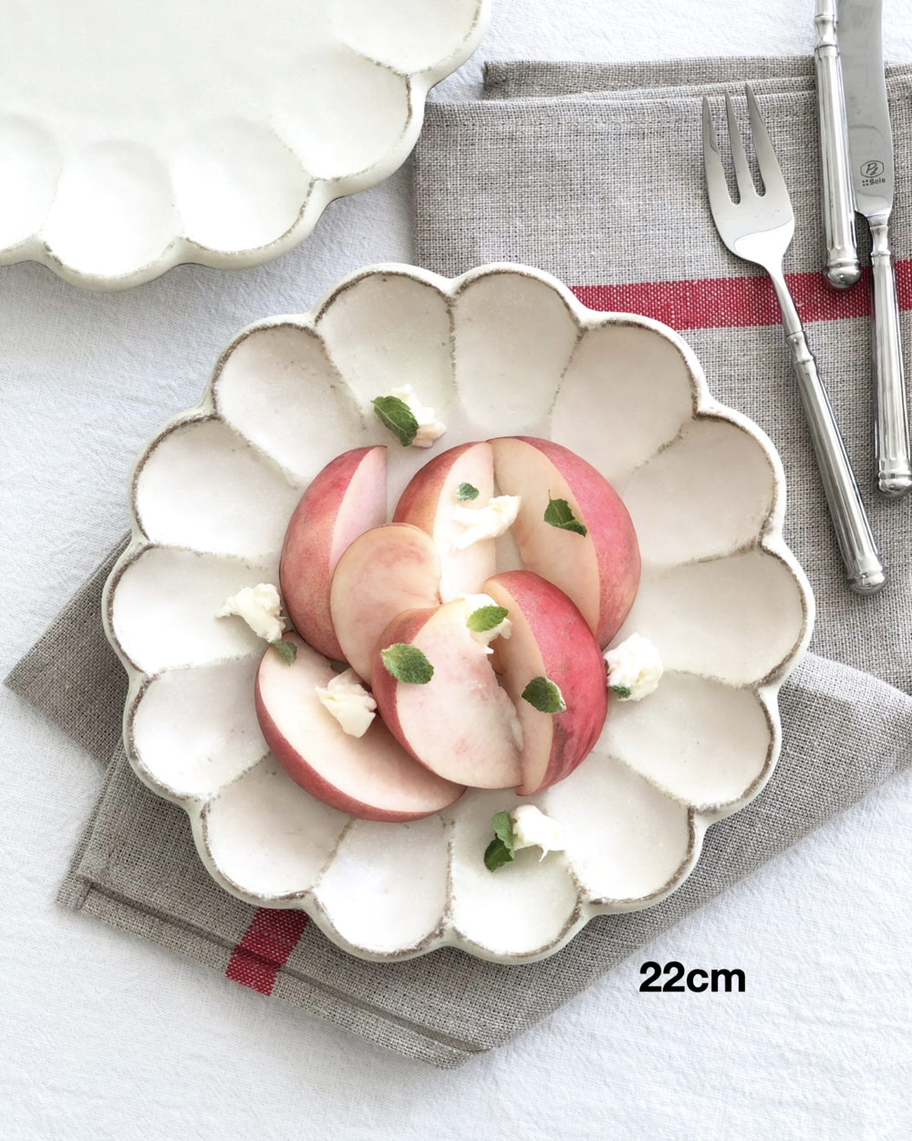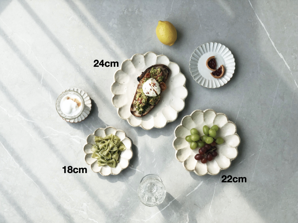 백토로 구현해낸 따뜻하고 부드러운 컬러톤과 내추럴하고 빈티지한 외관이 아름다운 제품입니다. 음식을 담으면 페탈 디자인이 도드라지면서 마치 음식을 가운데 두고 꽃이 핀 듯한 기분 좋은 착각을 하게 만들지요. 음식을 담았을 때 더 매력적인 제품이에요.