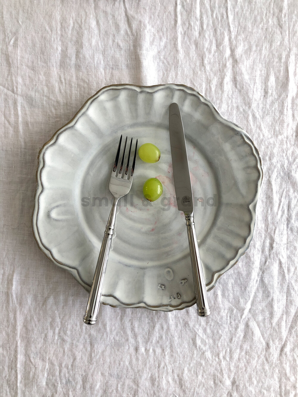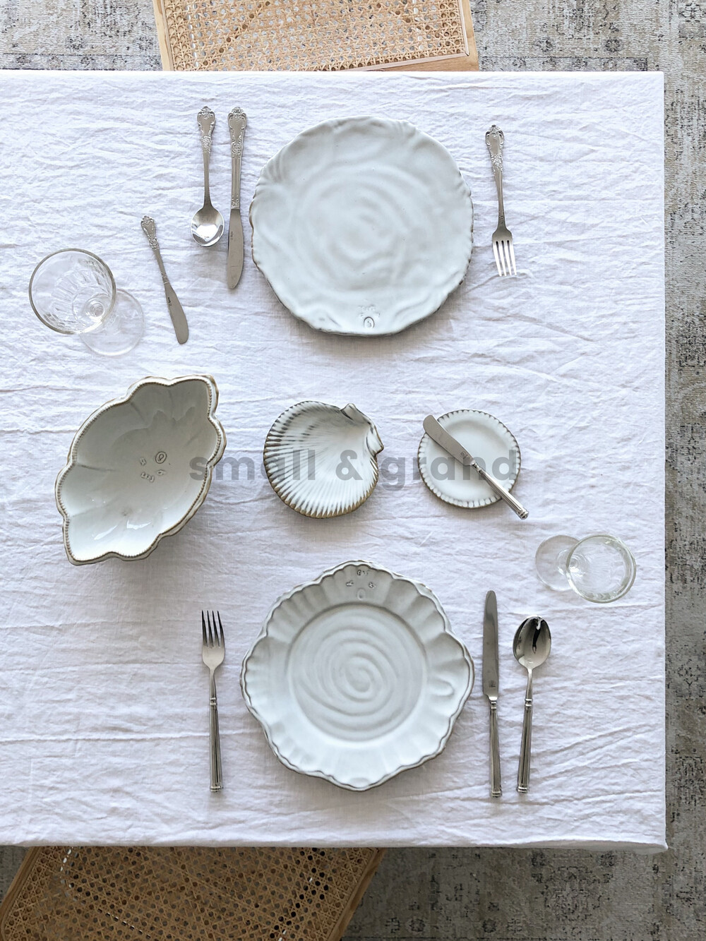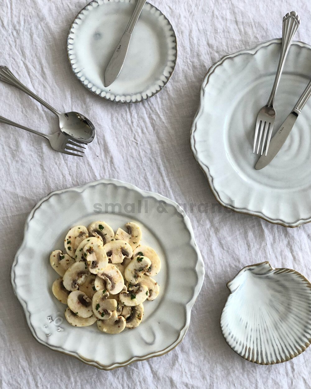Yarnnakarn 야나칸의 가장 대표적인 컬렉션인 Still Life Collection 스틸라이프 컬렉션 중 Star Dinner Plate 스타 디너 플레이트는 다양한 메뉴를 담아내기에 넉넉한 사이즈(26cm)로 디저트, 브런치, 디너 등 폭넓은 테이블세팅에 쓰임새가 많은 아이템입니다. 한눈에 시선을 끄는 장식적인 림 디자인은 담아내는 음식 뿐만 아니라 전체 테이블세팅이 더 풍성해보이도록 하여 마치 고급 레스토랑과 같은 무드를 완성해줍니다. 정형화되지 않은 내추럴한 실루엣과 그릇 하나하나 마다 새겨진 각인은 심플한 디자인 속 섬세함이 깃든 야나칸 브랜드의 감성을 잘 표현해줍니다.
